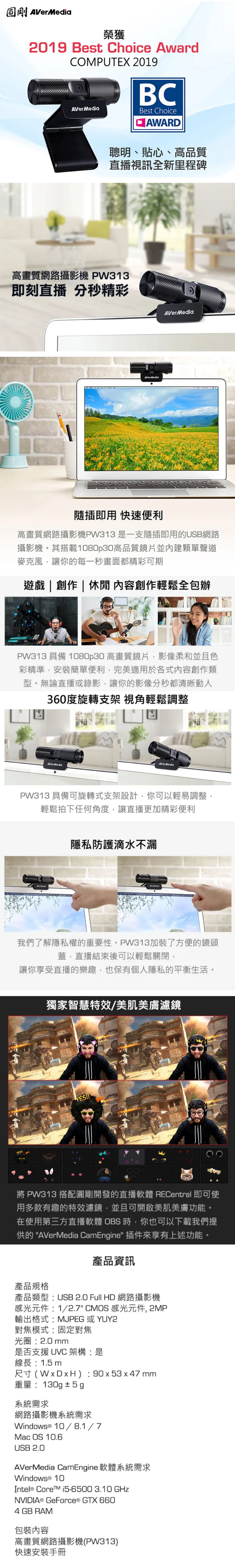 圓剛 PW313 高畫質網路攝影機/動態1080P 30FPS/靜態200萬畫素/旋轉式鏡頭/固定對焦