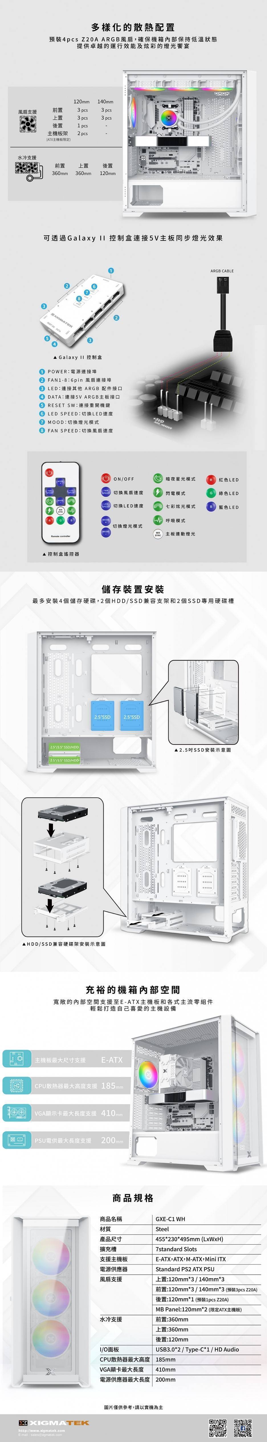 ▶主機板可支援至E-ATX ▶掀門磁吸式左側玻璃側板 ▶機頂配置Type-C孔位,擁有高傳輸速度 ▶附垂直顯卡套件可直立安裝顯卡 ▶充裕的機箱內部空間 ▶水冷供應器規格:上置與前置360mm,後置120mm ▶預裝4顆Z20A風扇與內建Galaxy II風扇控制套件 查看原廠資訊
