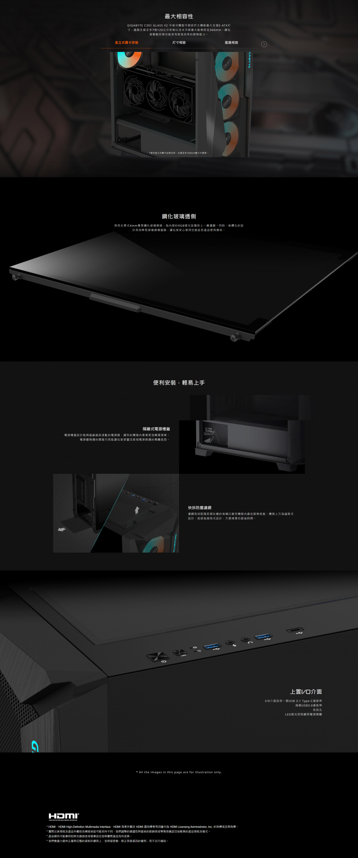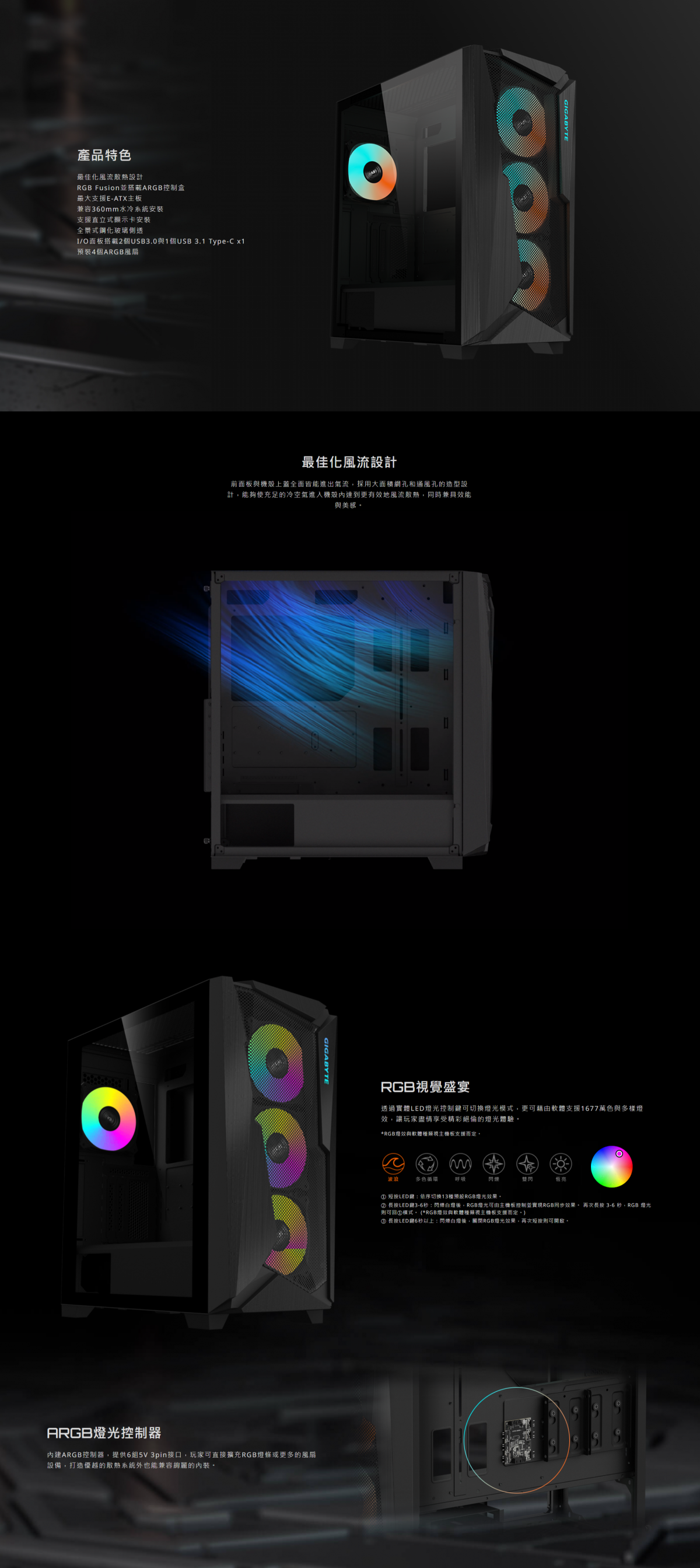 技嘉 C301 GLASS V2 黑 玻璃透側機殼 (E-ATX/Type-C/內建風扇前3後1/顯卡400mm/塔散170mm)