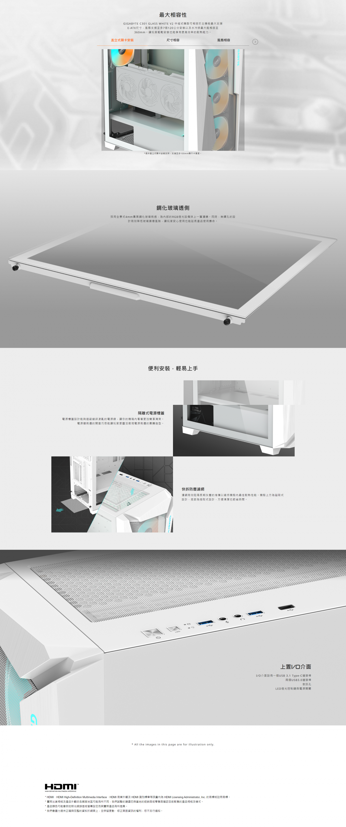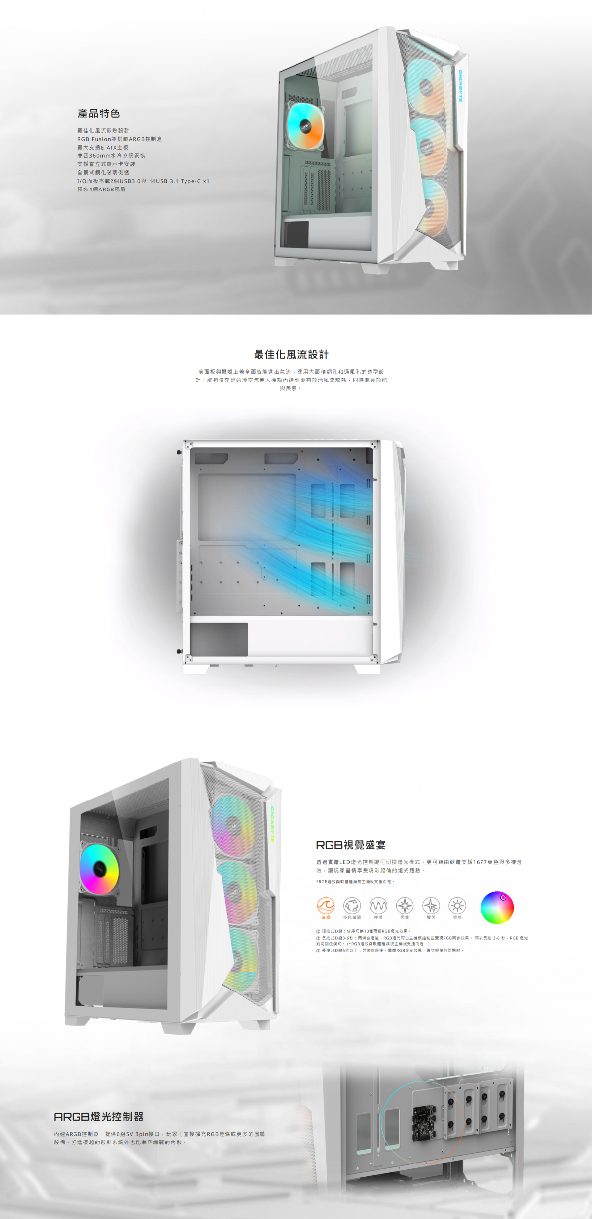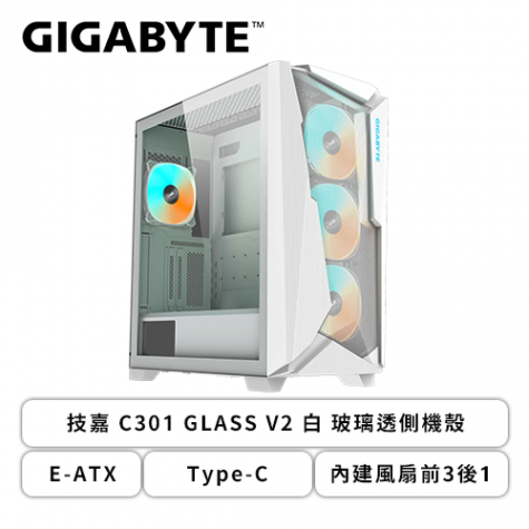 技嘉 C301 GLASS V2 白 玻璃透側機殼 (E-ATX/Type-C/內建風扇前3後1/顯卡400mm/塔散170mm)