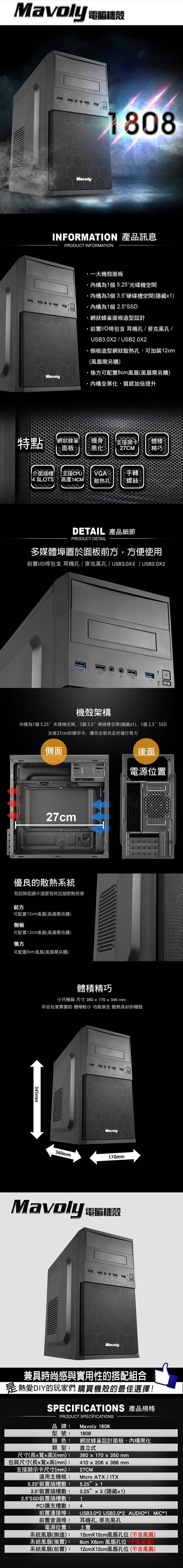 Mavoly 松聖 1808 電腦機殼 (M-ATX/網狀面板/內附風扇*1/5.25*1/顯卡270mm/塔散140mm)