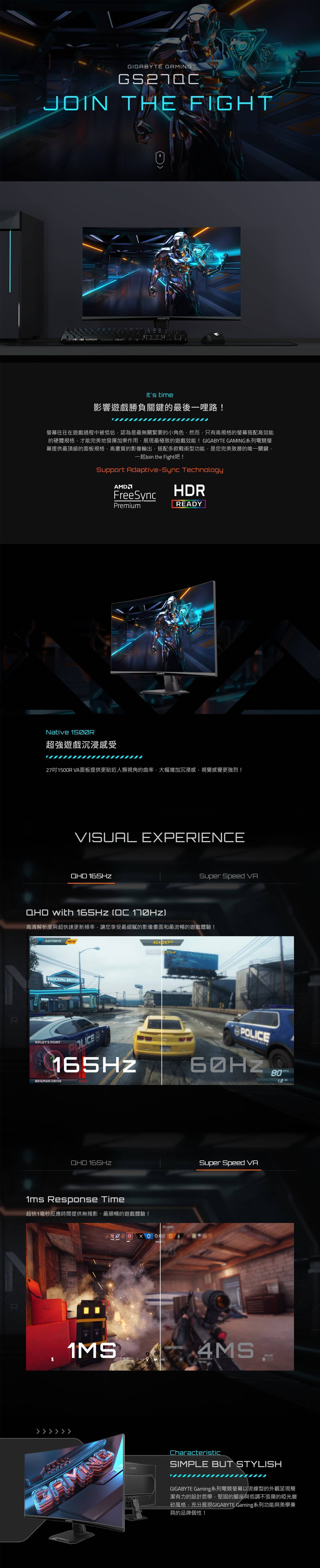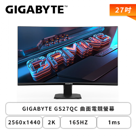 【27型】GIGABYTE GS27QC 電競螢幕 (DP/HDMI/SS VA/曲面/2K/1ms/165Hz(OC 170Hz)/HGR READY/FreeSync Premium/黑平衡技術/萊因2.0認證/低藍光/不閃屏/無喇叭/三年保固)