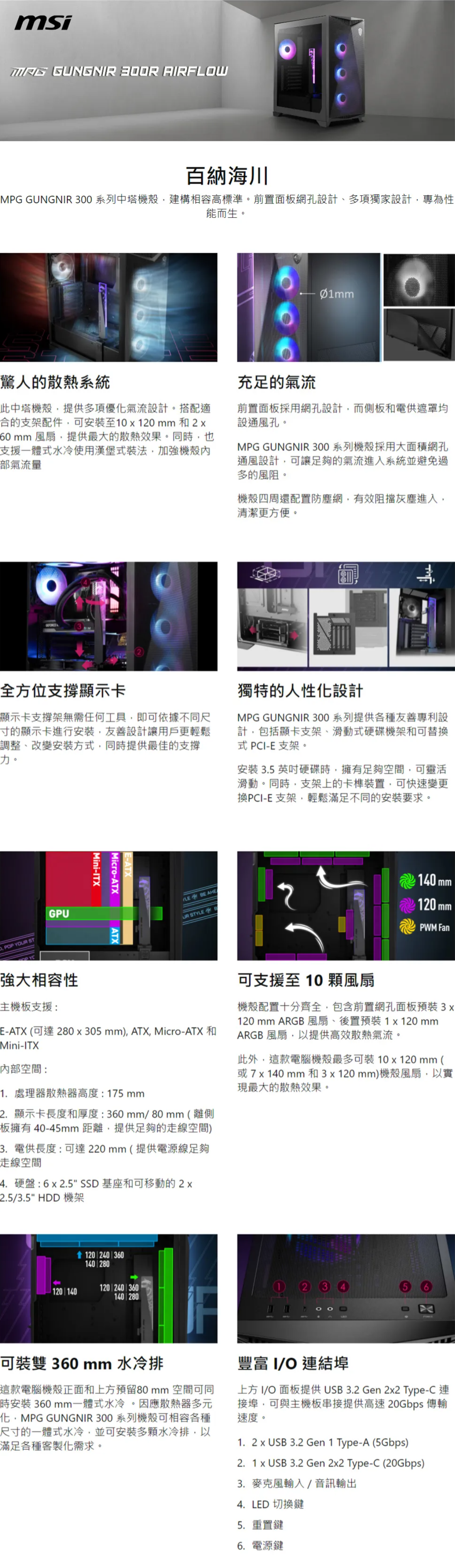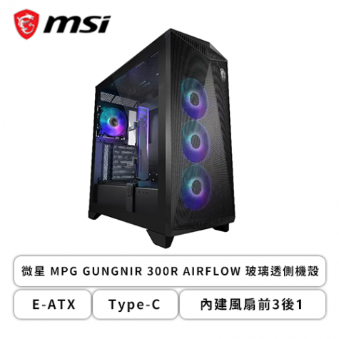 微星 MPG GUNGNIR 300R AIRFLOW 玻璃透側機殼 (E-ATX/Type-C/內建風扇前3後1/顯卡360mm/塔散175mm)