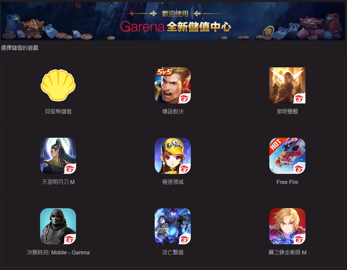 ▶1.進入Garena儲值中心>選擇貝殼幣儲值