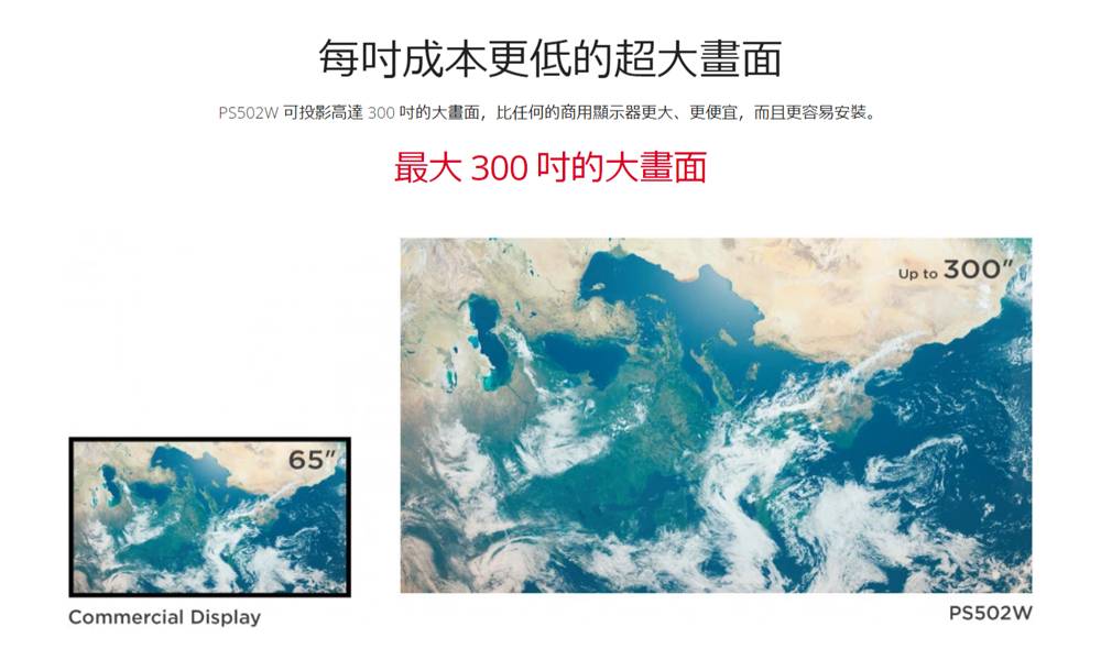 • 可投影高達 300 吋的超大畫面,每吋畫面成本更低