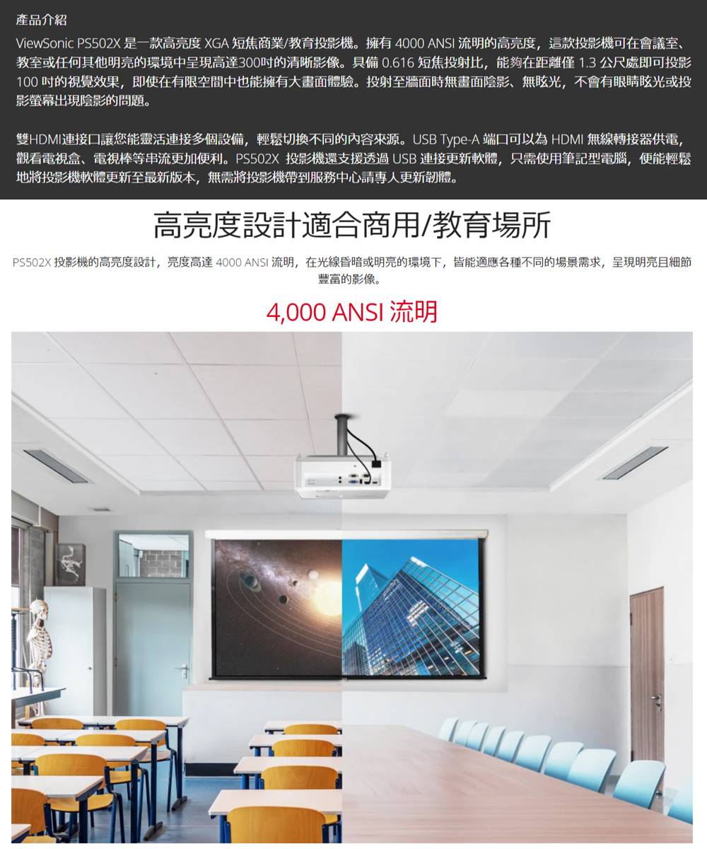 • 4,000 ANSI 流明能呈現清晰明亮影像