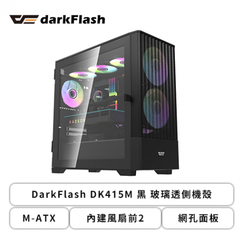 darkFlash DK415M 黑 玻璃透側機殼 (M-ATX/內建風扇前2/網孔面板/右側版進氣/顯卡410mm/塔散165mm)