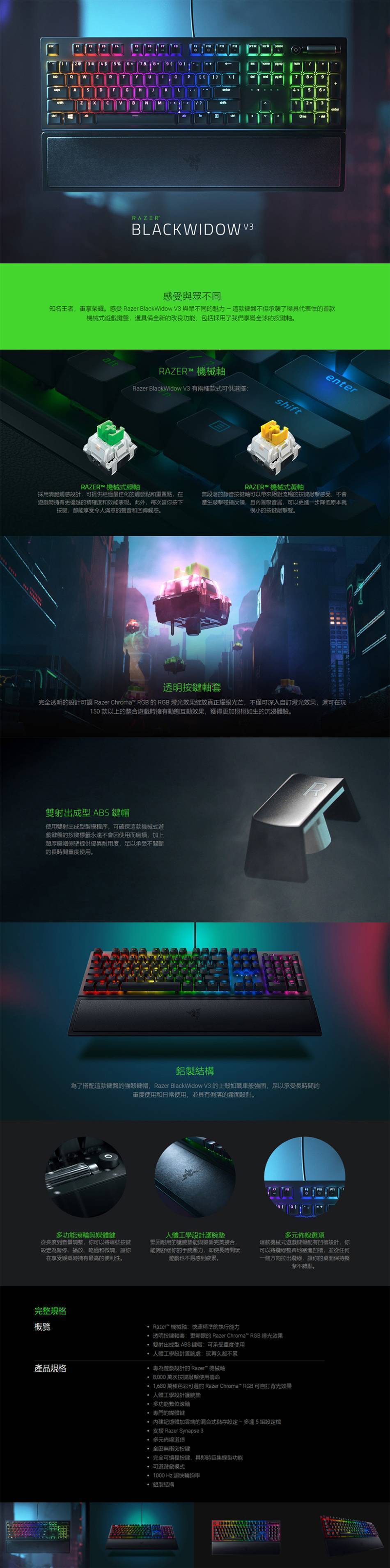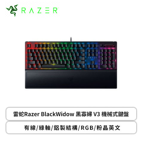 雷蛇Razer BlackWidow 黑寡婦 V3 機械式鍵盤/有線/綠軸/鋁製結構/RGB/粉晶英文