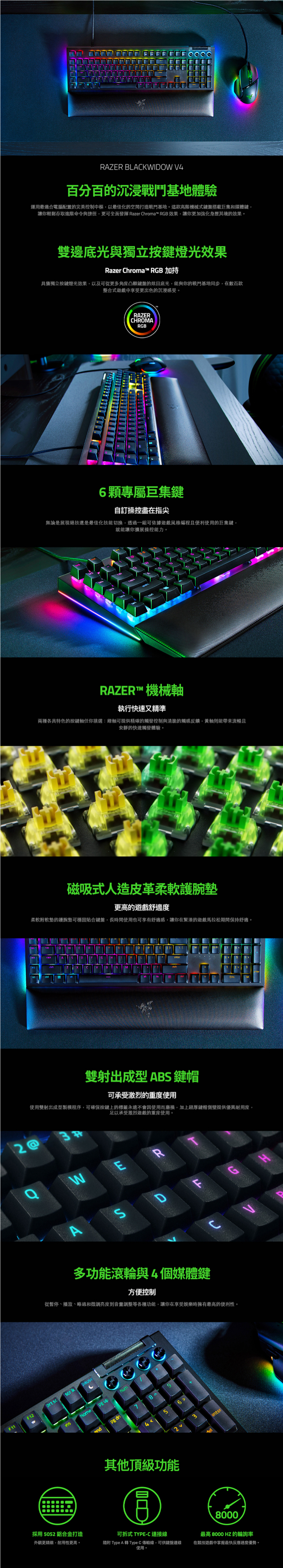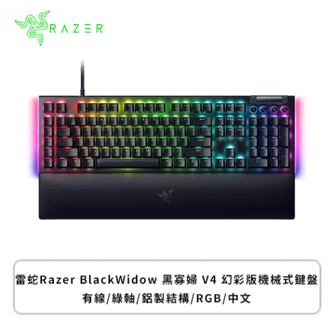 雷蛇Razer BlackWidow 黑寡婦 V4 幻彩版機械式鍵盤(黑色/有線/綠軸/鋁製結構/RGB/中文/1年保固)