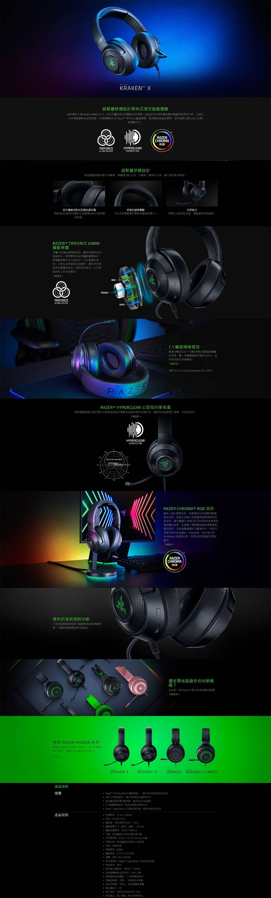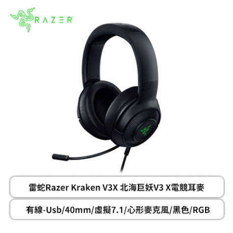 雷蛇Razer Kraken V3X 北海巨妖V3 X電競耳麥/有線-Usb/40mm/虛擬7.1/心形麥克風/黑色/RGB