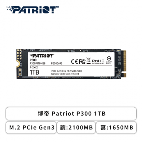 博帝 Patriot P300 1TB/M.2 PCIe Gen3/讀:2100MB/寫:1650MB/五年保