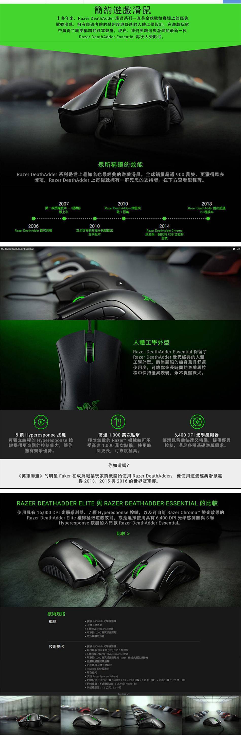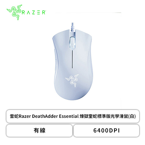 雷蛇Razer DeathAdder Essential 煉獄奎蛇電競滑鼠(白色/有線/6400Dpi/96克/綠光/2年保固)