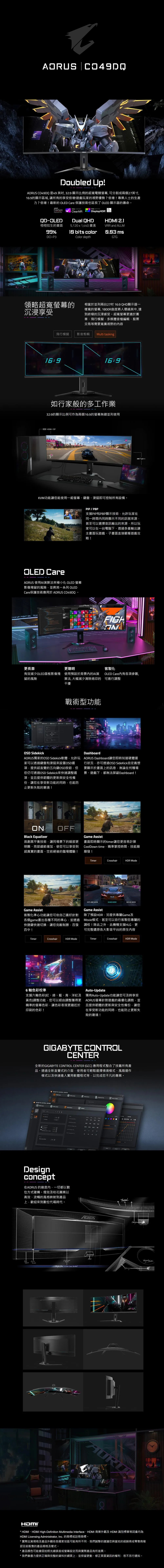 【49型】 AORUS CO49DQ 電競螢幕 (DP/HDMI/Type-C/OLED/曲面/0.03ms/144Hz/FreeSync Premium PRO/KVM/HDR400/內建喇叭/三年保固)