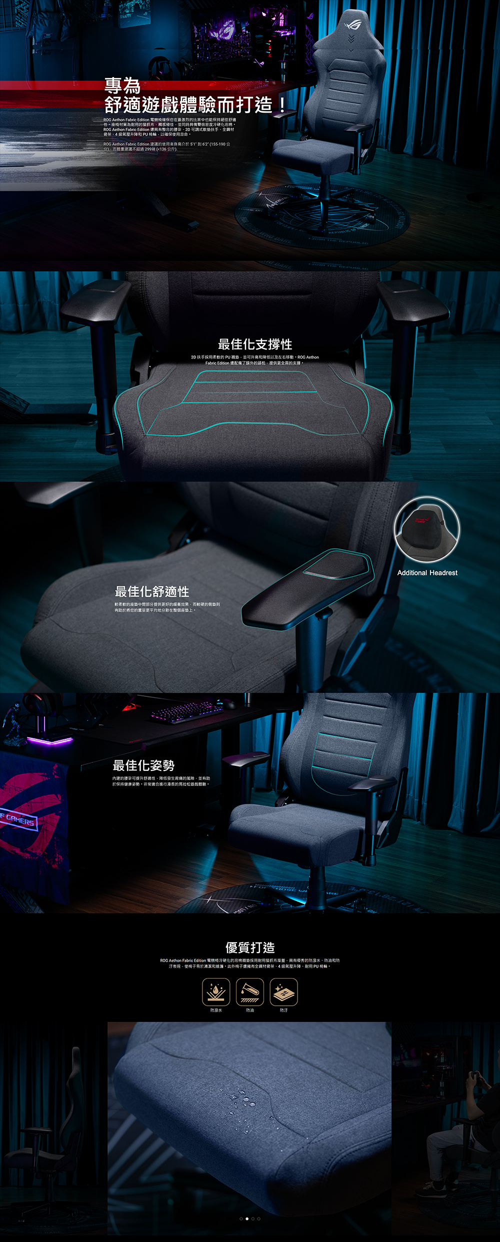 Premium ROG Aethon Gaming Chair Fabric Edition 電競椅採用全鋼材骨架、雙倍密度座墊、含2D軟墊扶手,並內建腰靠以提供最佳化的舒適性
