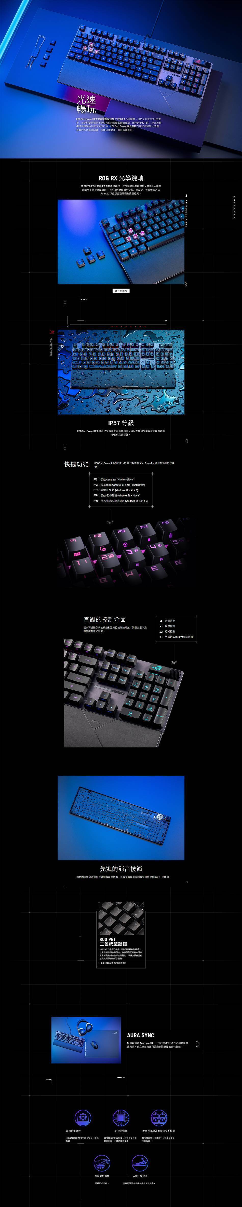 - ROG RX 光軸:預潤 RX 紅軸及 RX 青軸具備中央 LED燈校 ,提供穩定不晃動且順時回饋得鍵擊體驗