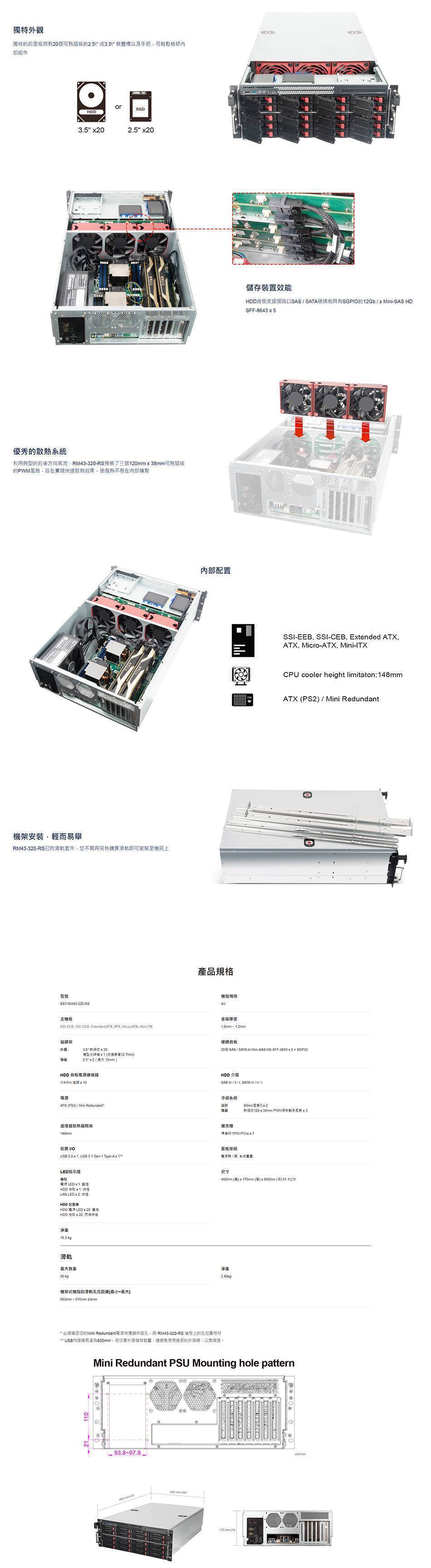 銀欣 SST-RM43-320-RS 工業機殼 (4U Mini-SAS HD SFF-8643 12 Gb/s 20埠 2.5/3.5 硬碟熱插拔伺服器機殼)