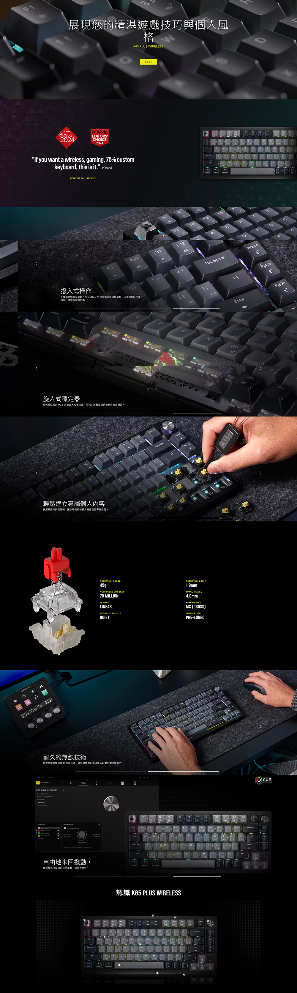 海盜船CORSAIR K65 PLUS WIRELESS 三模無線機械式電競鍵盤(灰色)