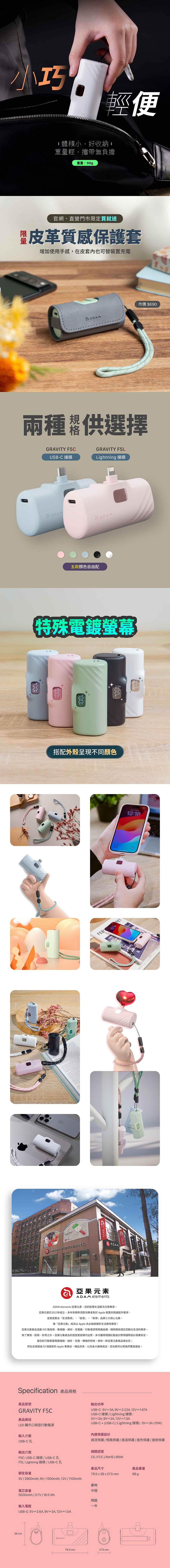 ●5000 mAh 行動電源,支援快充,可同時支援兩個設備充電,單孔最高輸出可達20W 。