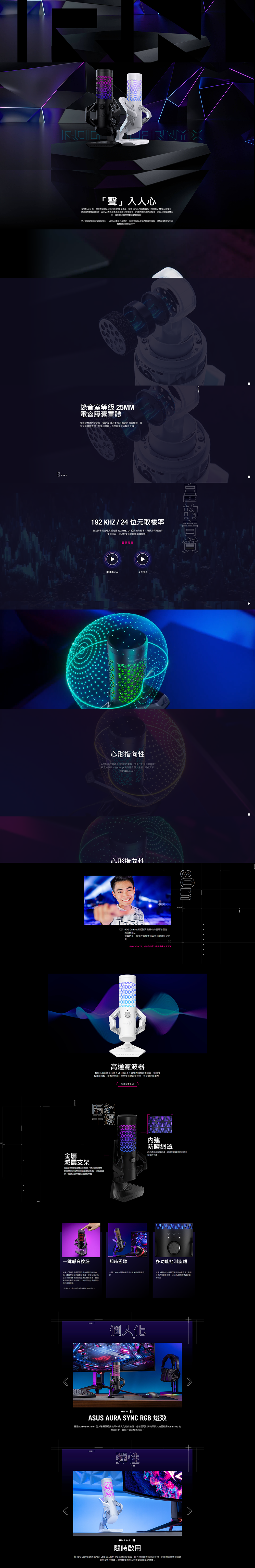 ROG Carnyx 擁有 25 mm 錄音室等級電容式膠囊單體和心形指向性收音、192 kHz / 24 位元取樣率、高通濾波器、內建防噴網罩、優質金屬減震架,以及 ASUS Aura Sync RGB 燈光。