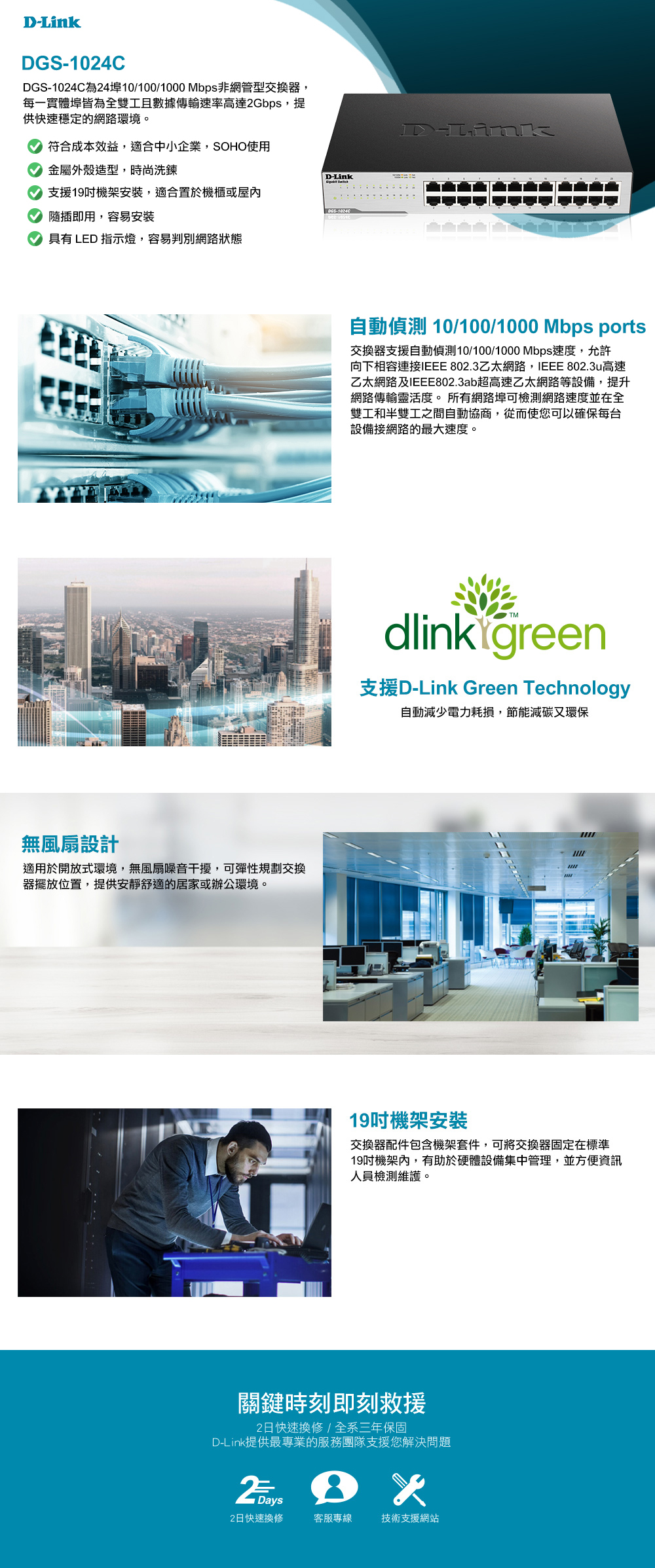 D-Link DGS-1024C 24埠GIGA非網管節能型交換器/桌上型超高速乙太網路交換器/附19吋機架配件/3年保固