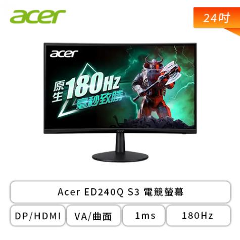 【24型】Acer ED240Q S3 電競螢幕 (DP/HDMI/VA/曲面/1ms/180Hz/FreeSync Premium/內建喇叭/三年保固)