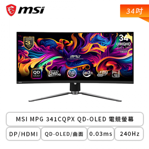 【34型】MSI MPG 341CQPX QD-OLED 電競螢幕 (DP/HDMI/Type-C(98w)/QD-OLED/曲面/2.5K/0.03ms/240Hz/Adaptive Sync/HDR400/量子點/無喇叭/三年保固)