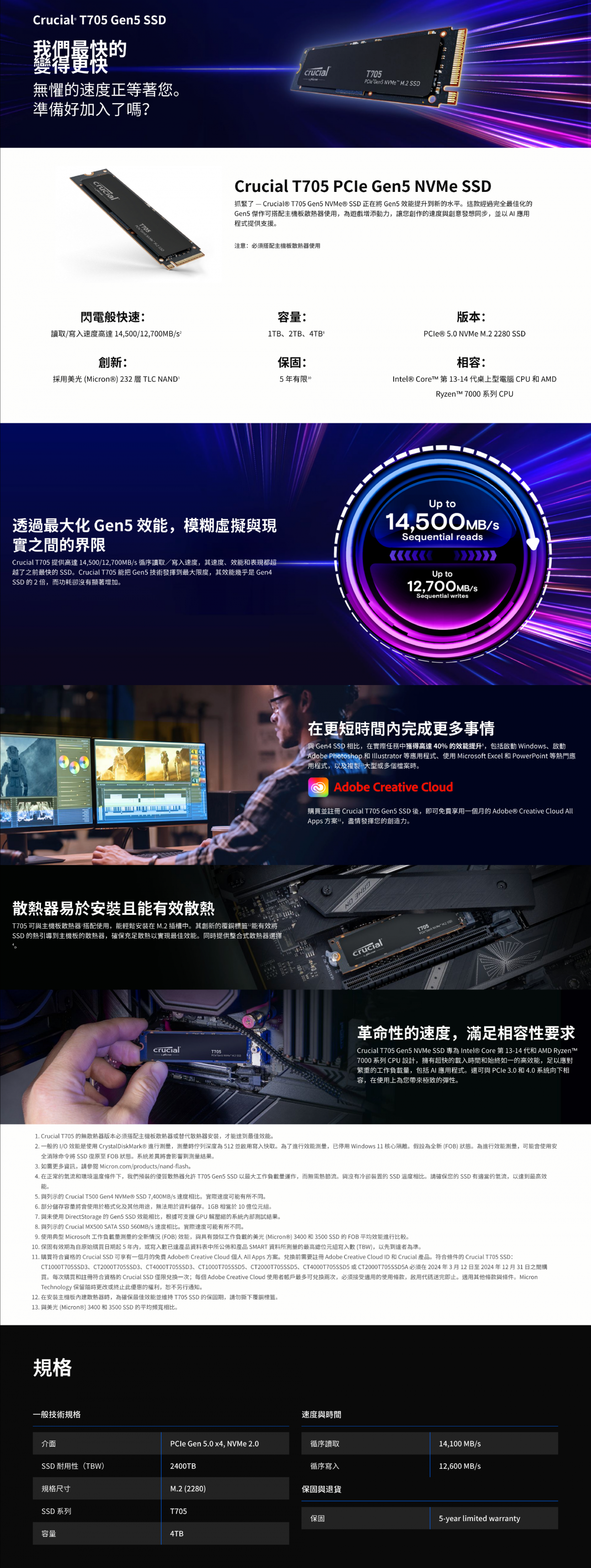 美光 Crucial T705 4TB(無散熱片)/M.2 PCIe Gen5/讀:14100M/寫:12600M/TLC/五年保