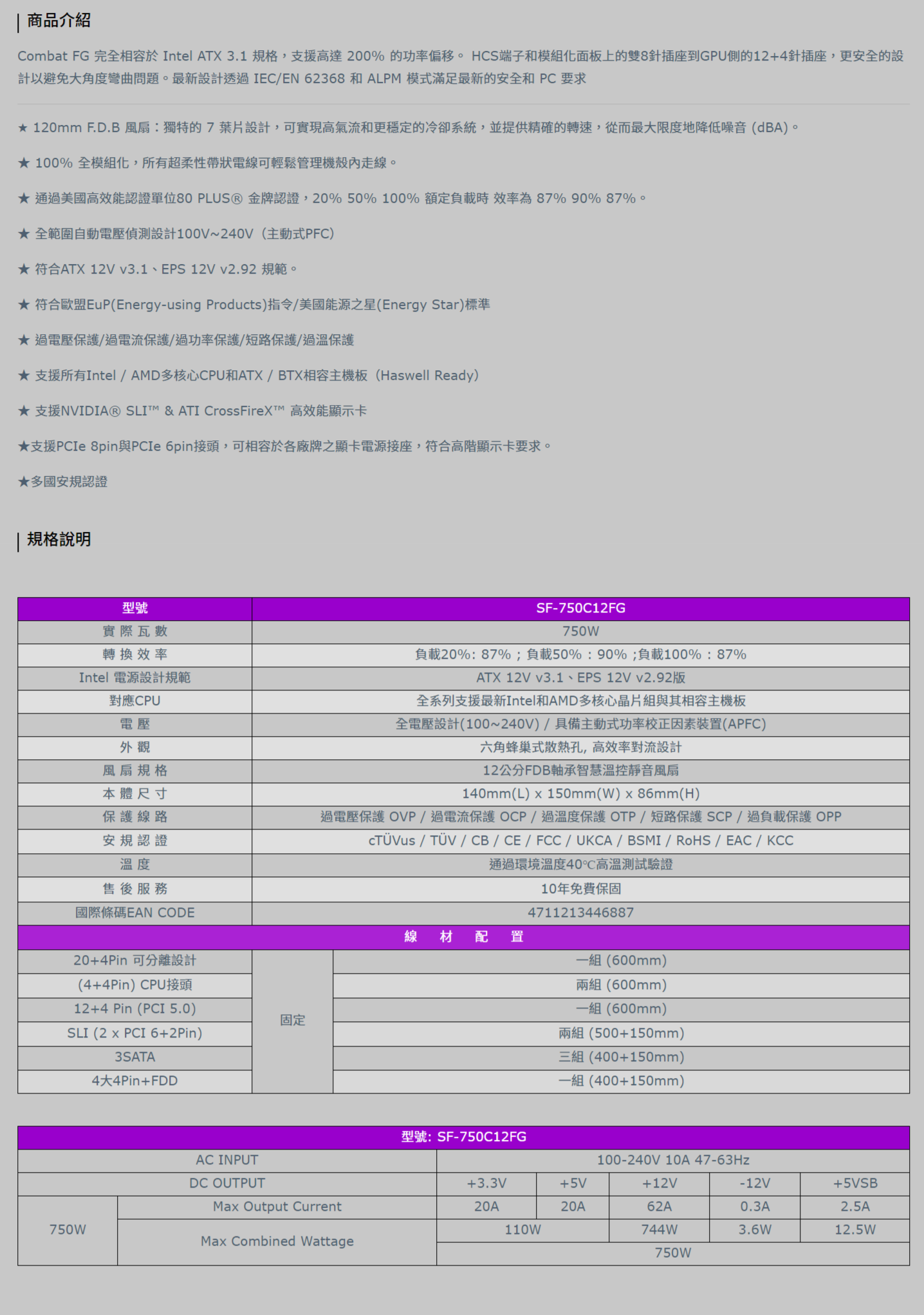 ▶ 通過美國高效能認證單位80 PLUS® 金牌認證,20% 50% 100% 額定負載時 效率為 87% 90% 87%。