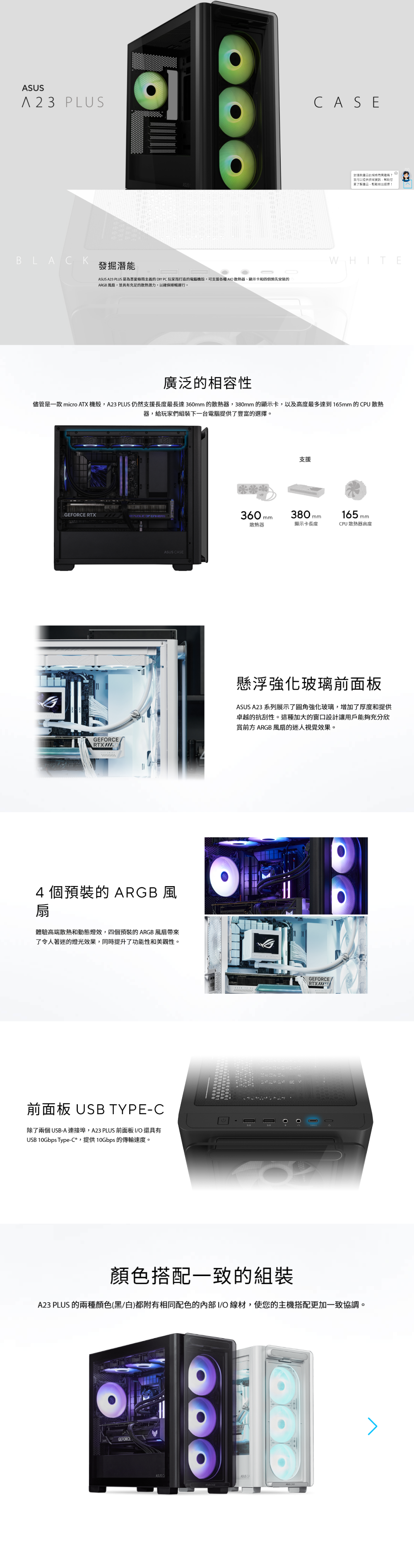 ▶廣泛的相容性:A23 PLUS 支援散熱器最長達 360mm ,顯示卡長 380mm ,以及最高達到 165mm 的 CPU 散熱器,並搭載前面板 Type C 連接埠。