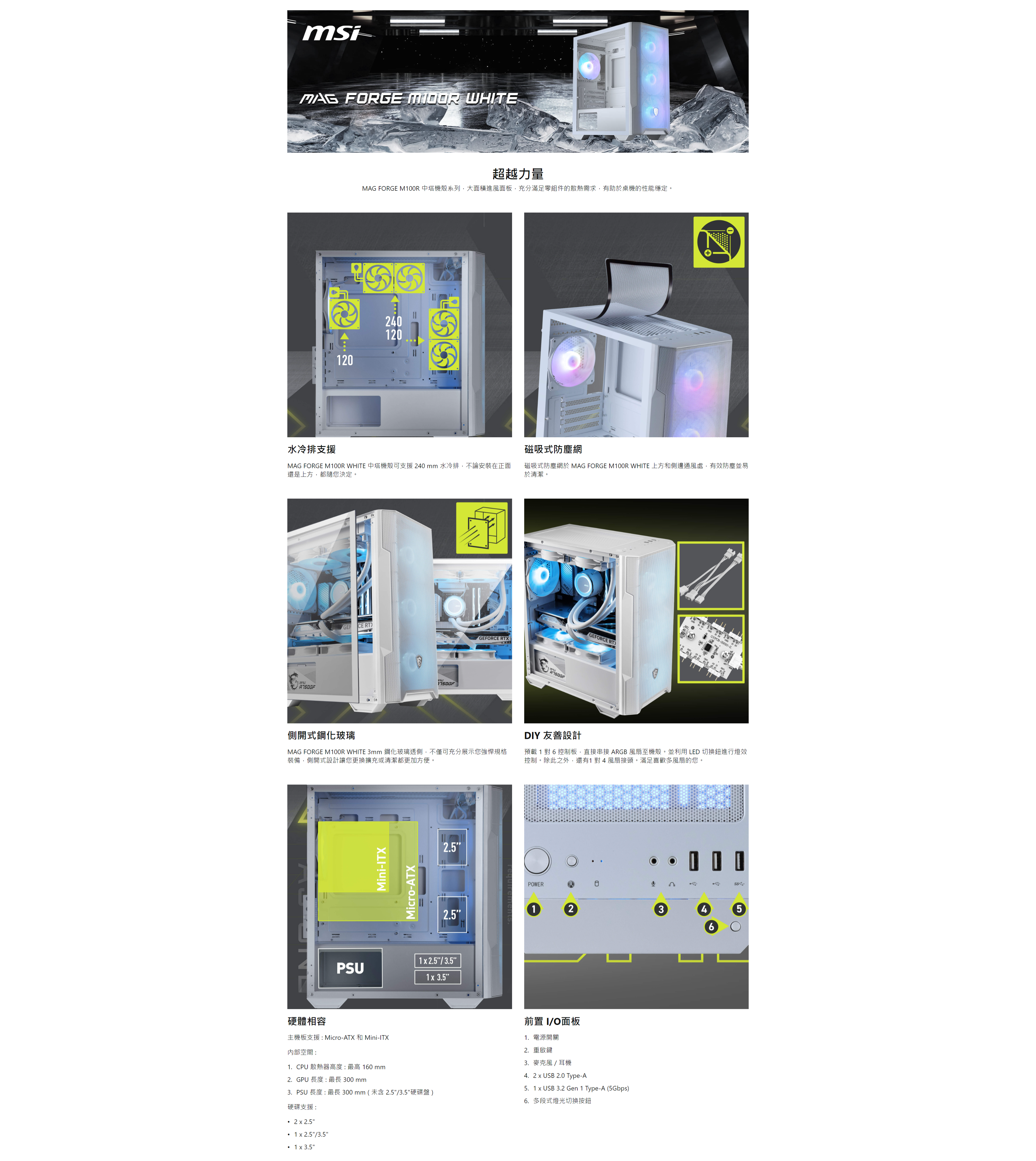 ▶最多可安裝6個系統風扇,為整個系統提供通風和穩定的性能。 ▶內置 ARGB 風扇,具有醒目生動的燈光效果。 ▶顯示 RGB 燈光效果的鋼化玻璃側板。 ▶頂部通風口上的磁吸式防塵網可輕鬆拆卸以利清潔。 ▶利用風扇線材為您的系統添加更多風扇。 ▶可以從燈光效果資料夾中,挑選最想要的一款 ▶內建 ARGB 風扇,具有醒目生動的燈光效果。 ▶通過 LED 開關按鈕可以直觀地控制和切換 9 種燈光效果 查看原廠資訊