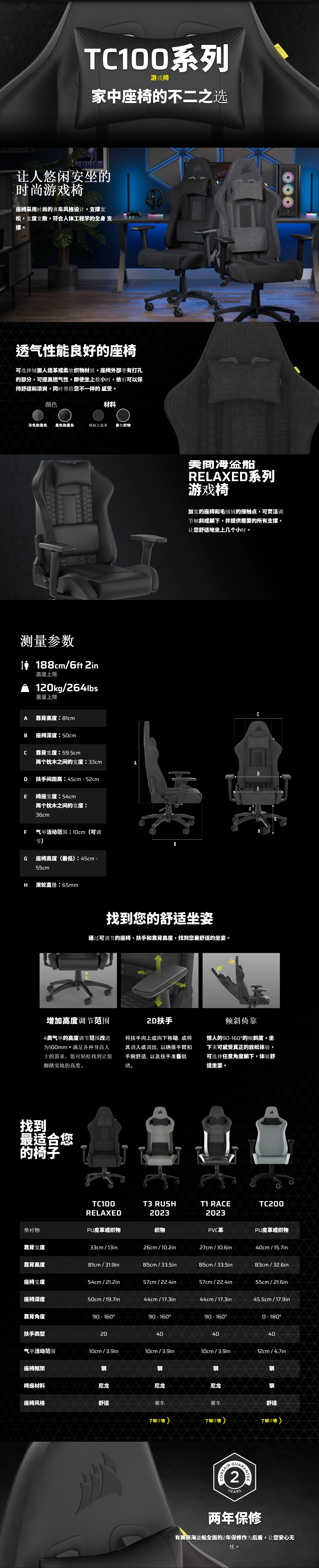 •無論是玩遊戲還是使用 CORSAIR TC100 RELAXED 電競椅,都能舒適地躺下,它採用賽車風格的設計,座椅表面更寬。