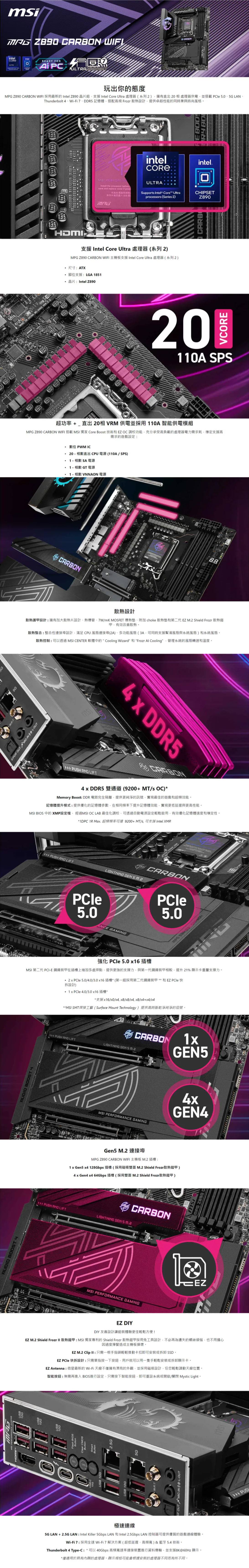 微星 MPG Z890 CARBON WIFI (ATX/1H2P/Realtek ALC1220P/WiFi 7+BT 5.4/註冊五年保) 20+1+1+1相供電