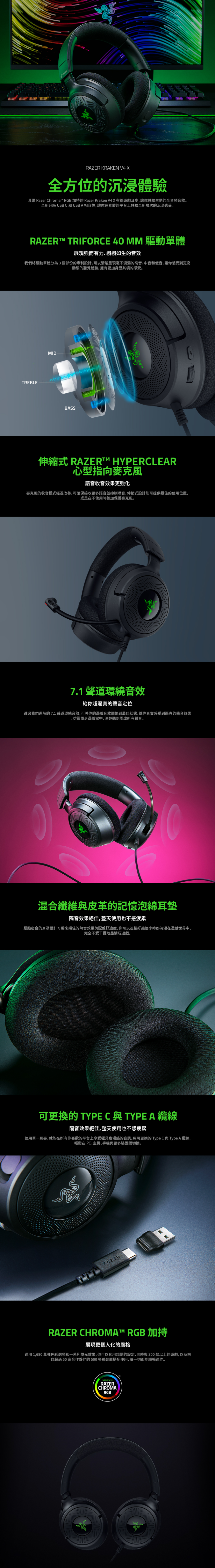 雷蛇 RAZER 北海巨妖 Kraken V4 X 有線電競耳機/黑色/有線-Usb/40mm/虛擬7.1/心形麥克風/RGB