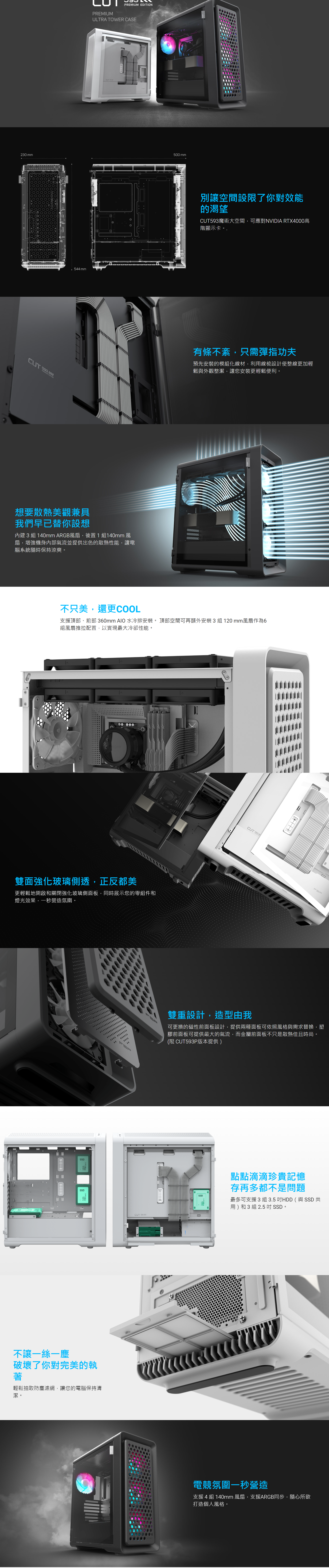全漢 CUT593P 黑 玻璃透側機殼 (ATX/Type-C/內建風扇前3後1/內附模組化線材/雙前面板(塑膠+金屬)/雙面玻璃/顯卡400mm/塔散175mm)