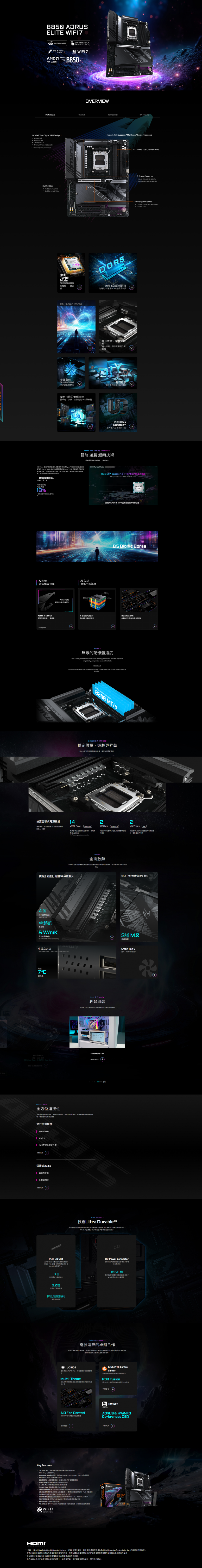 技嘉 B850 AORUS ELITE WIFI7 (ATX/1H1P/Realtek 2.5Gb/Wi-Fi 7+BT 5.4/註冊五年保) 14+2+2相供電