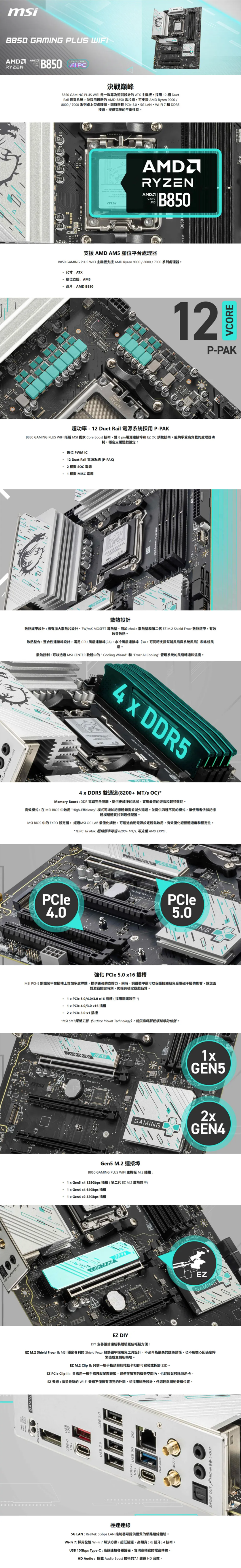 微星 B850 GAMING PLUS WIFI(ATX/1P/Realtek 5Gb/Wi-Fi 7+BT 5.4/註冊五年保)