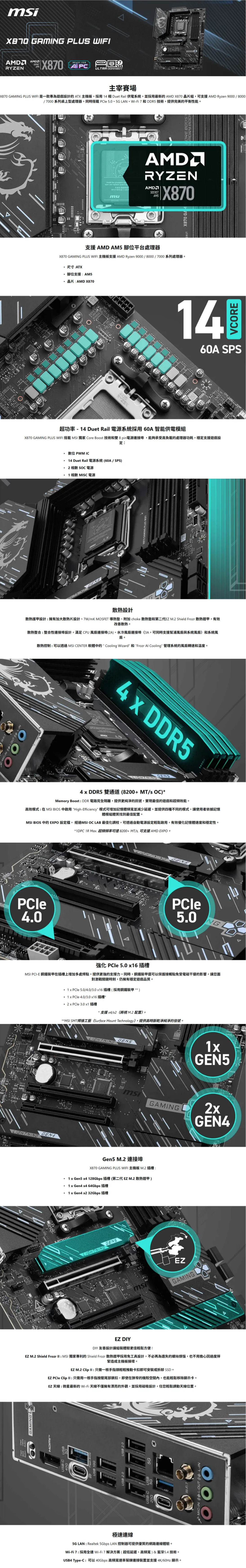 微星 X870 GAMING PLUS WIFI (ATX/1H1P/Realtek 5Gb/Wi-Fi 7+BT 5.4/註冊五年保) 14+2+1相供電