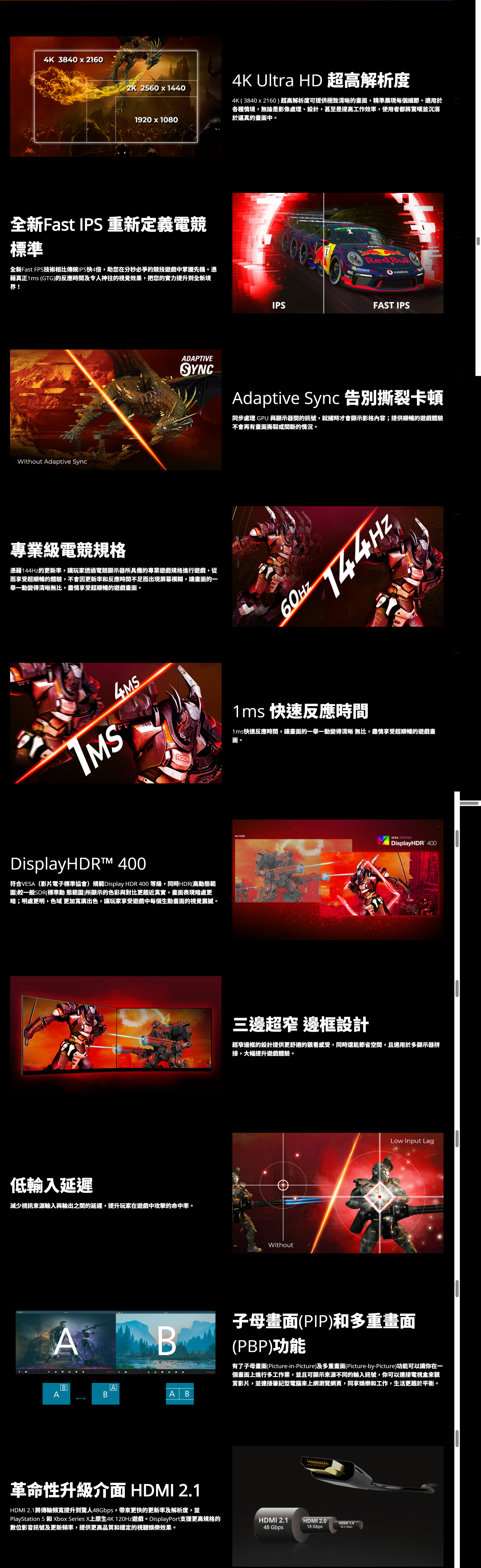 最佳解析度 3840 × 2160 @ 144Hz – DisplayPort1.4+DSC, HDMI2.1