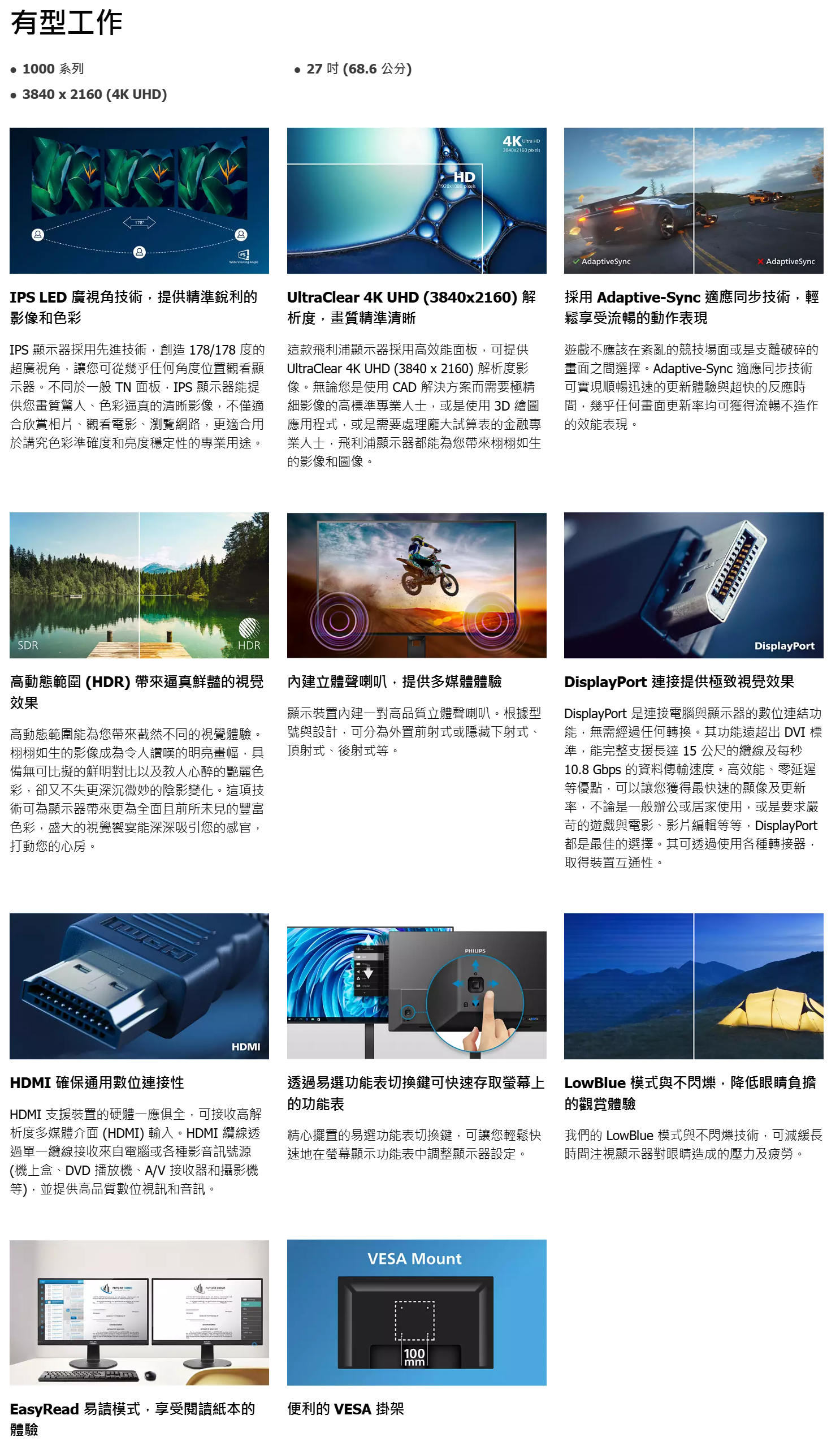 【27型】PHILIPS 飛利浦 27E1N1800A 液晶螢幕 (DP/HDMI/IPS/4K/60Hz/AdaptiveSync/不閃屏/低藍光/內建喇叭/三年保固)