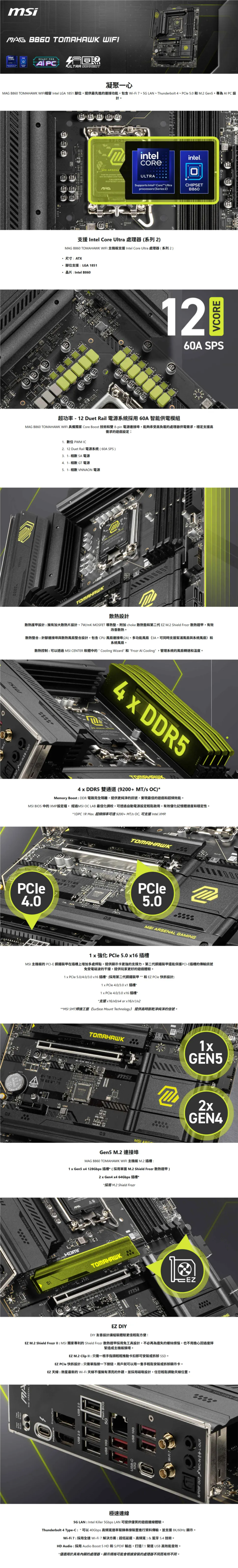 微星 MAG B860 TOMAHAWK WIFI (ATX/1H1P/Intel 5Gb/Wi-Fi 7+BT 5.4/註冊五年保) 12+1+1+1相供電