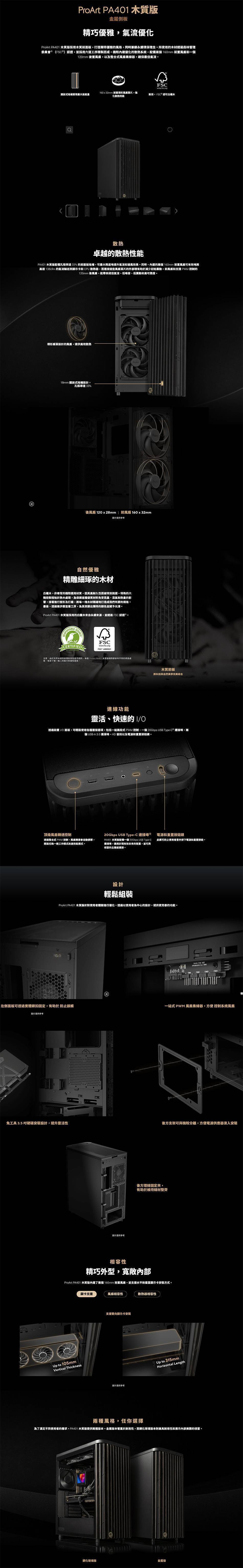 華碩 ProArt PA401 Wood 木質透側版 玻璃透側機殼 (ATX/Type-C/電源閂鎖/內建風扇前2後1/顯卡315mm/塔散160mm)