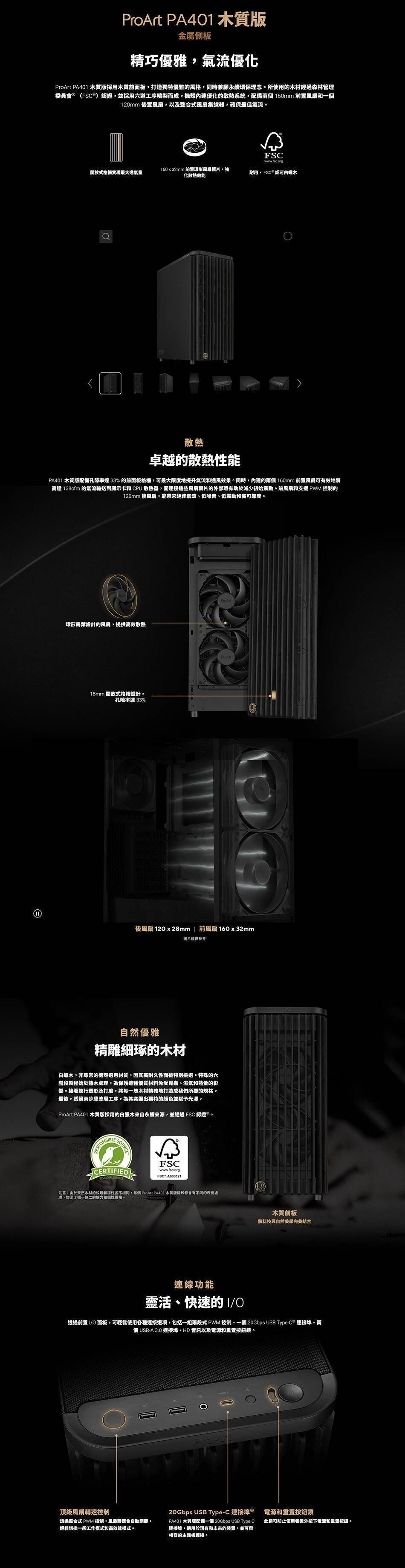 華碩 ProArt PA401 Wood 木質金屬版 電腦機殼 (ATX/Type-C/電源閂鎖/金屬側板/內建風扇前2後1/顯卡315mm/塔散160mm)