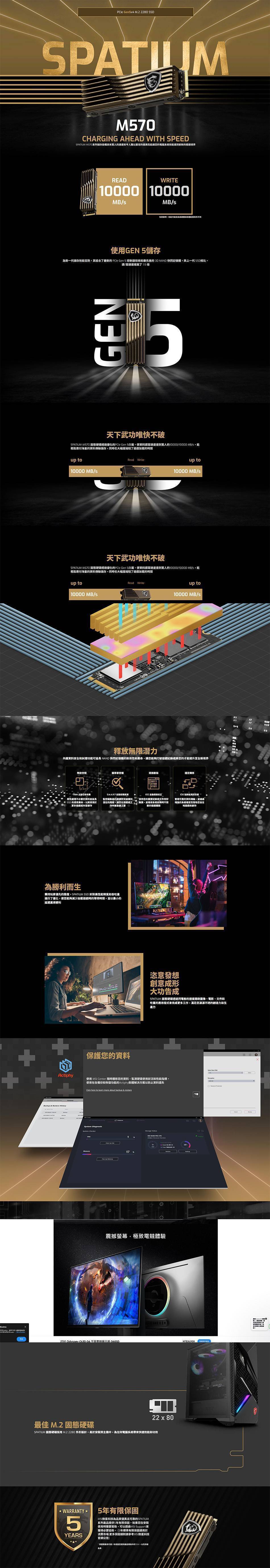 微星 MSI SPATIUM M560 2TB/M.2 PCIe Gen5/讀:10300M/寫:8700M/TLC/五年保