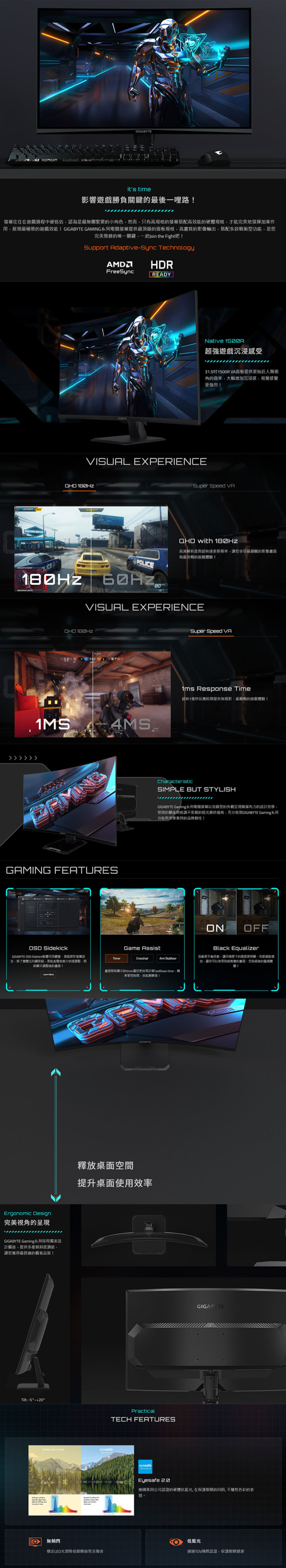 震撼視覺體驗:31.5 英吋 1500R 曲面 VA 面板,180Hz 超高刷新率,1ms 反應時間,帶來沉浸式遊戲享受。