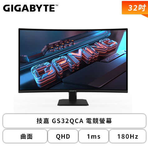 【32型】GIGABYTE GS32QCA 電競螢幕 (DP/HDMI/SS VA/曲面/2K/1ms/180Hz/HDR Ready/FreeSync/黑平衡技術/萊因2.0認證/低藍光/不閃屏/無喇叭/三年保固【福利品出清】