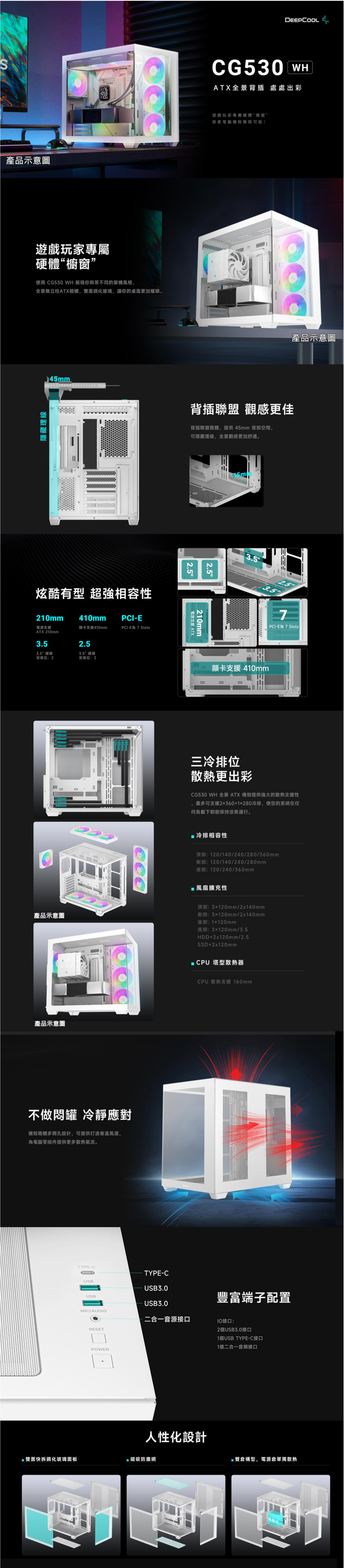 DEEPCOOL CG530 4F WH 白 全景玻璃機殼 (ATX/Type-C/內建風扇側3後1/無A柱/支援背插主板/顯卡410mm/塔散160mm)