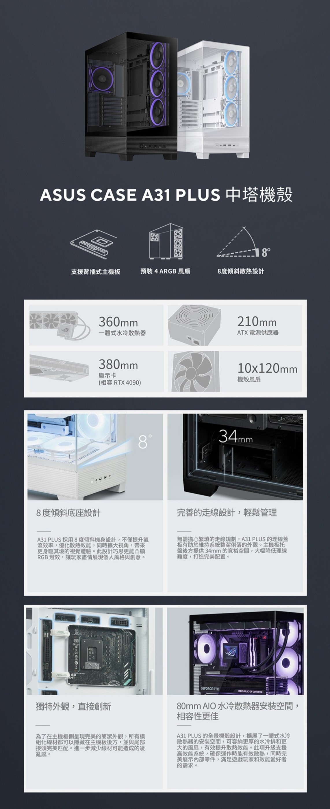 ▶廣泛的相容性:A31 PLUS 支援散熱器最長達 360mm 並搭配厚度達 80mm 的風扇,顯示卡長 380mm ,以及最高達到 165mm 的 CPU 空冷散熱器。