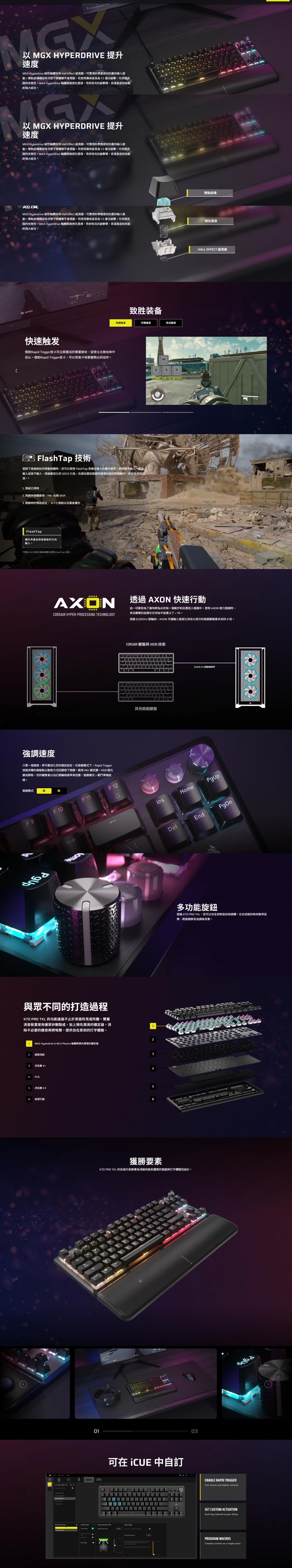 CORSAIR K70 PRO TKL 讓您在遊戲中更快速地做出反應,橫掃所有對手,此外還配備可調式 MGX Hyperdrive 軸體、Rapid Trigger,展現無懈可擊的打字聲響體驗。