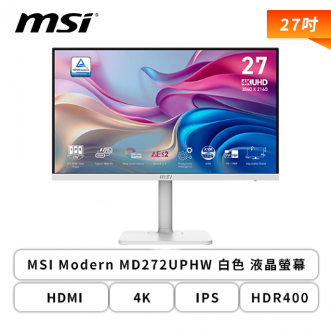 【27型】MSI Modern MD272UPHW 白色 液晶螢幕 (DP/HDMI/Type-C(98W)/IPS/4K/HDR400/KVM/可升降/可旋轉/防閃爍/低藍光/內建喇叭/三年保固)