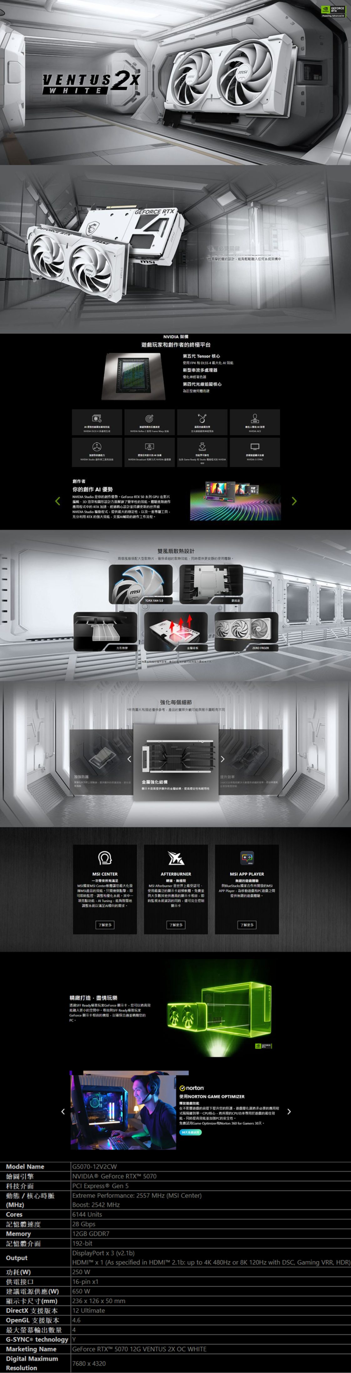 微星 RTX 5070 12G VENTUS 2X OC WHITE (std:2557MHz/雙風扇/註冊四年保/白色/長23.6cm)
